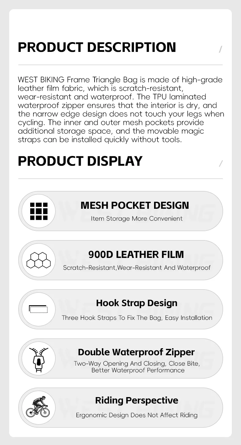 WEST BIKING Traingle Bike Frame Bag https://www.beaverbike.ca/product/west-biking-traingle-bike-frame-bag/?utm_source=rss&utm_medium=rss&utm_campaign=west-biking-traingle-bike-frame-bag https://www.beaverbike.ca/product/west-biking-traingle-bike-frame-bag/#respond Fri, 08 Aug 2025 02:23:09 +0000 https://www.beaverbike.ca/?post_type=product&p=6013 WEST BIKING Frame Triangle Bag: high - grade leather film fabric (scratch - resistant, wear - resistant, waterproof); TPU waterproof zipper (keeps interior dry); narrow edge (no leg contact); inner/outer mesh pockets (extra storage); movable magic straps (tool - free quick install).