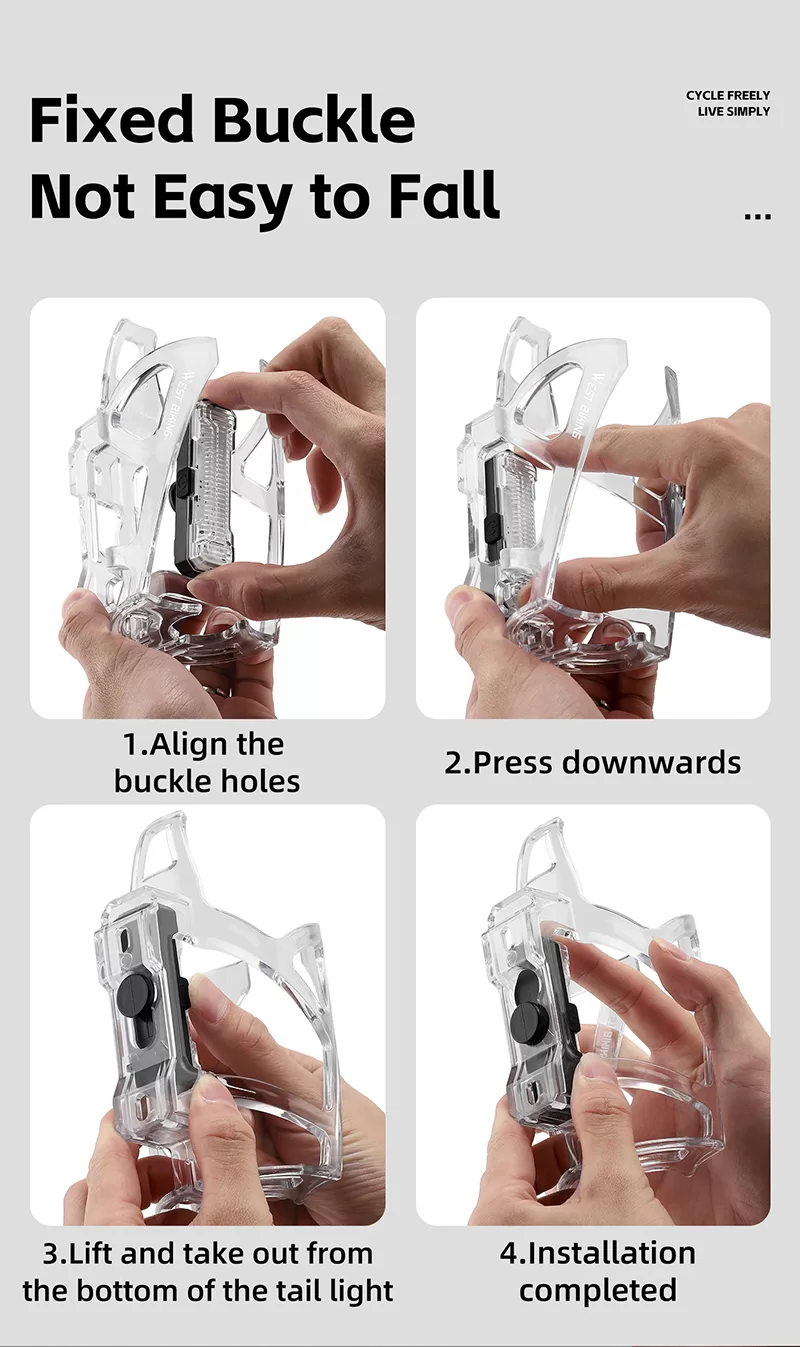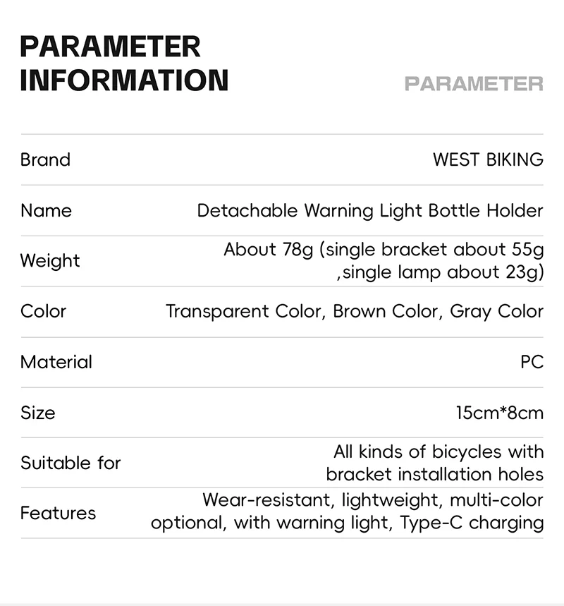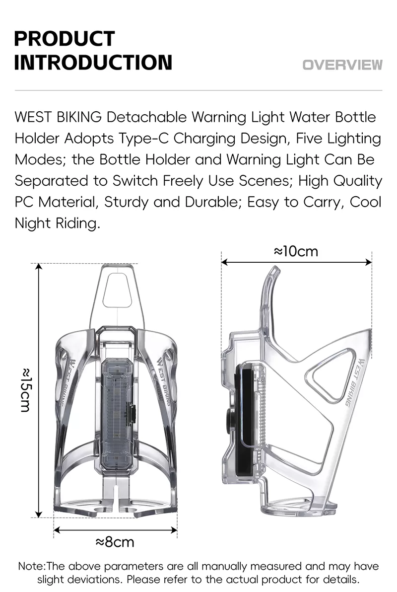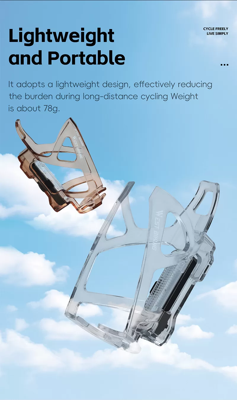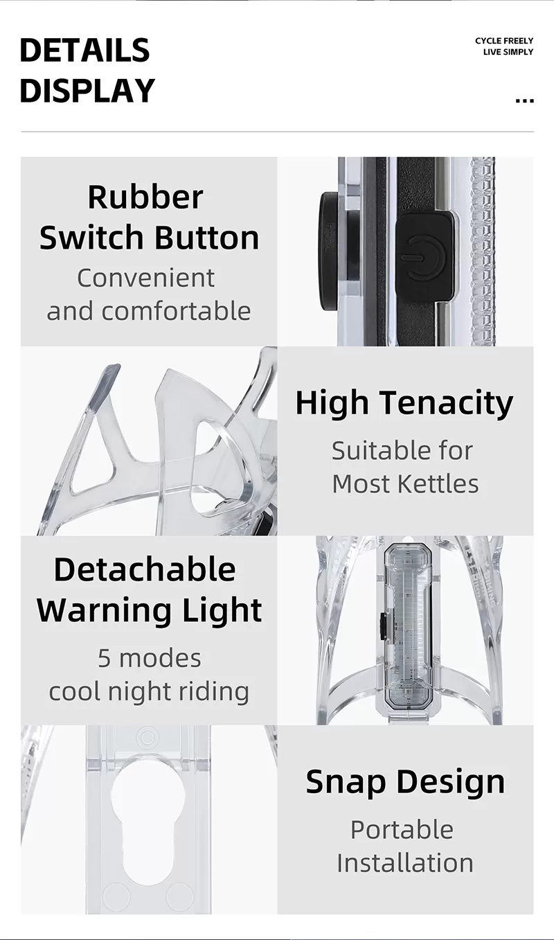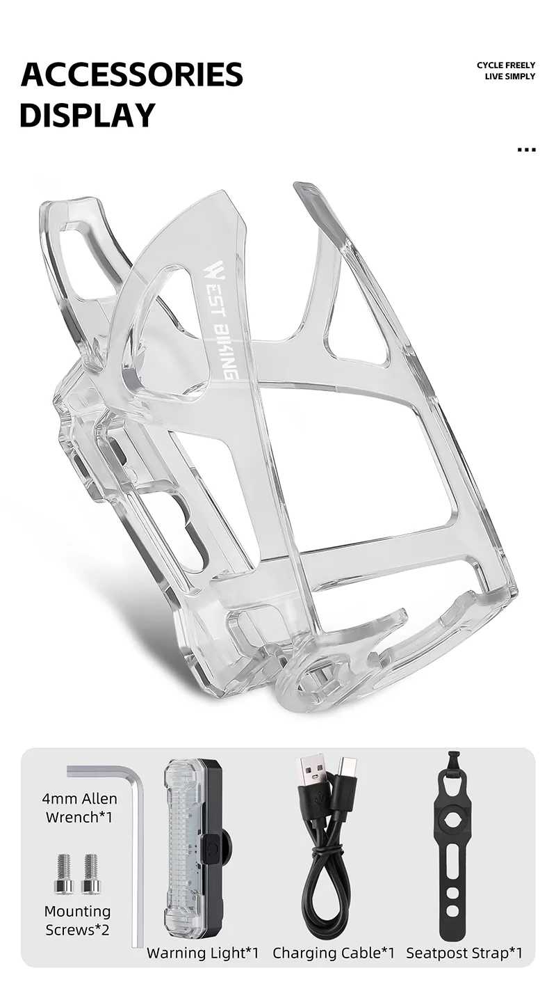 • Design: The transparent, skeletal - structured cage is designed to hold a water bottle, and the integrated warning light enhances cycling safety, especially in low - light conditions.