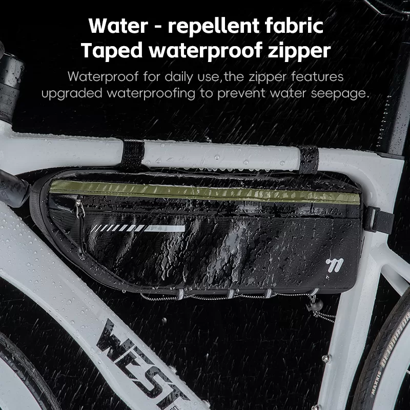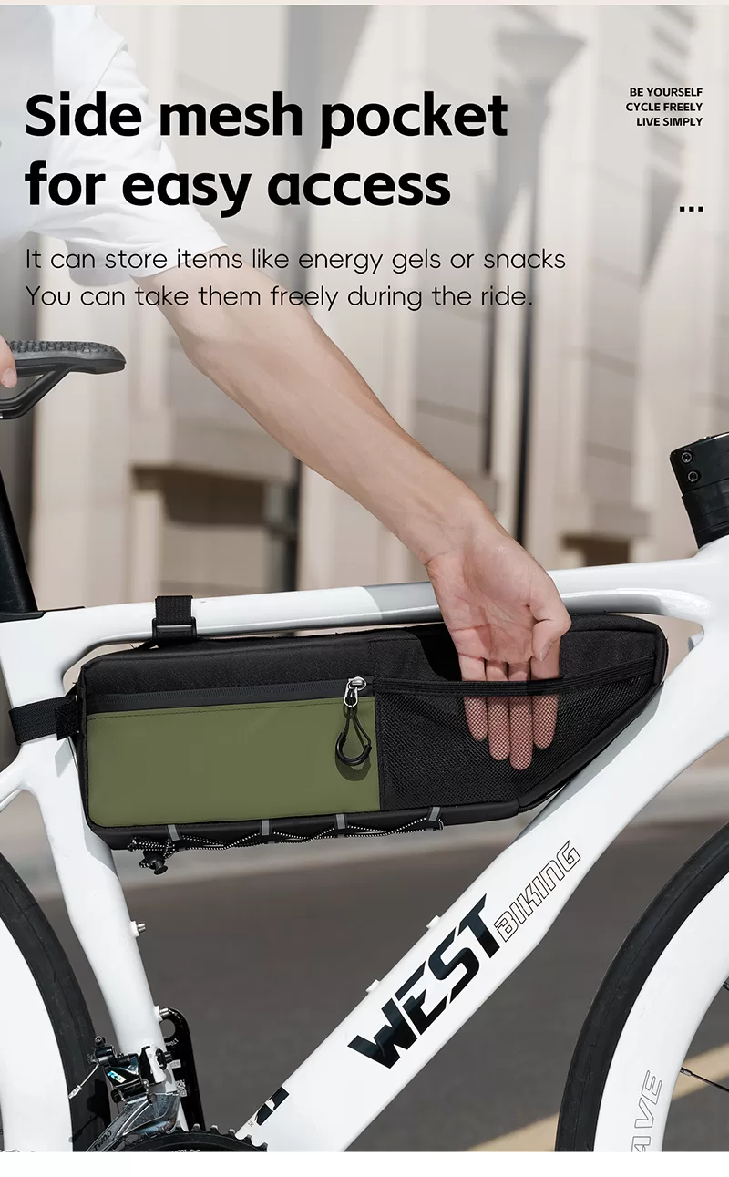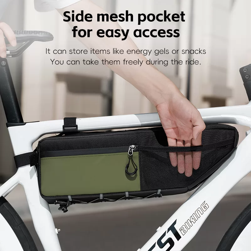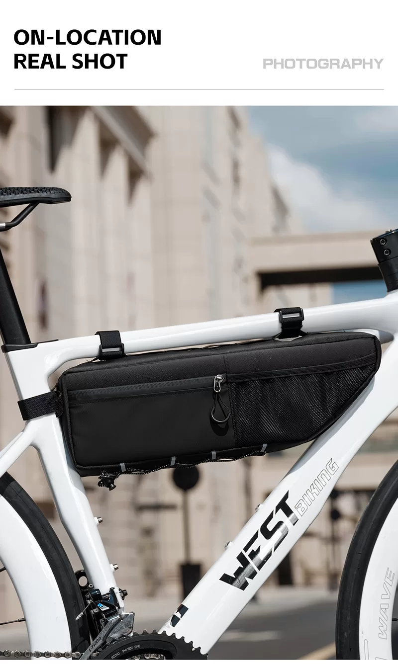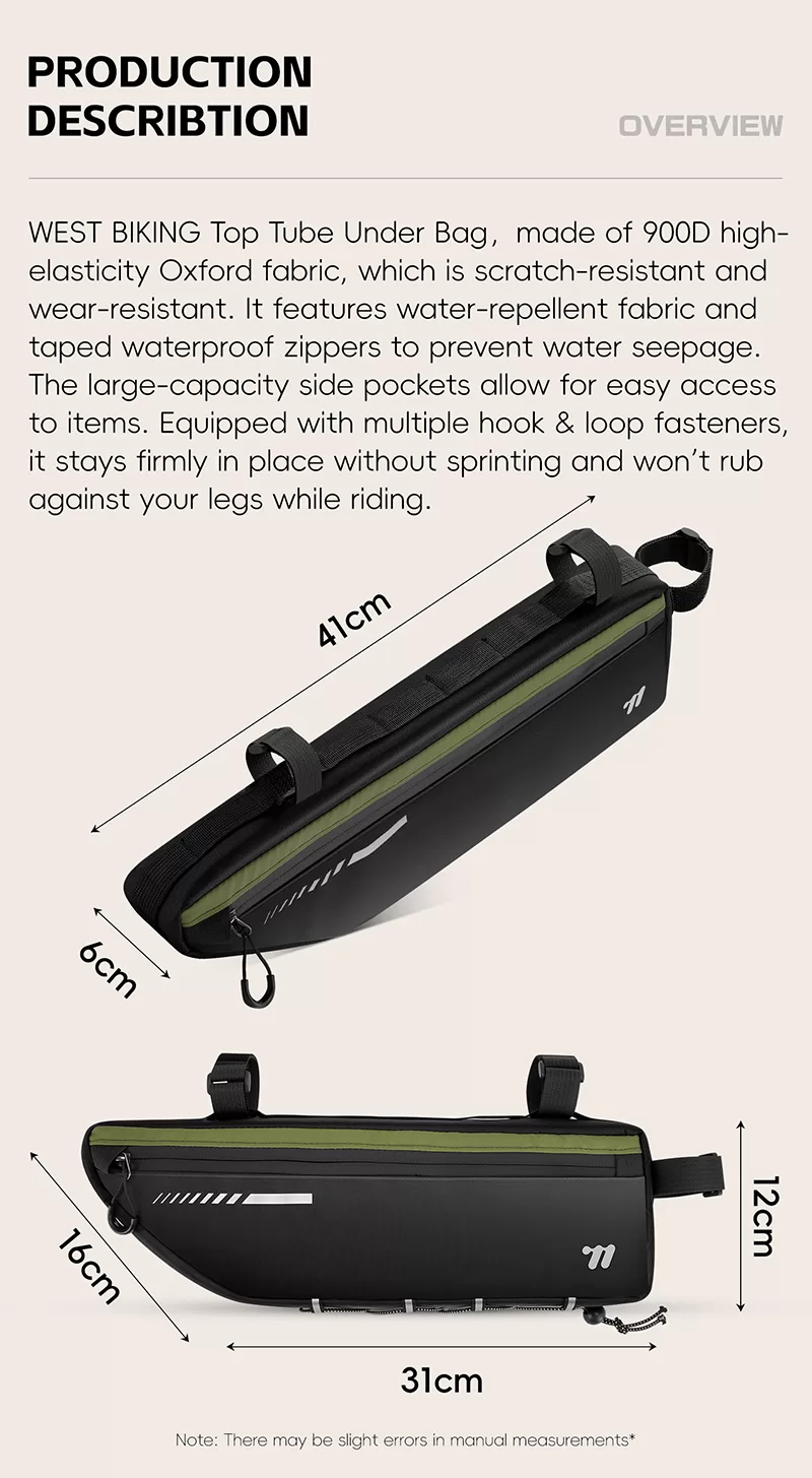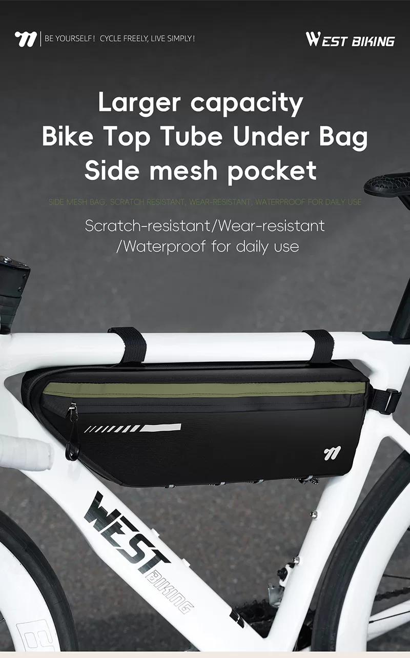 WEST BIKING Top Tube Under Bag is made of 900D high-elasticity Oxford fabric, which is scratch-resistant and wear-resistant. It features water-repellent fabric and waterproof zippers to prevent water seepage. Large-capacity side pockets allow for easy access to items. Multiple hook & loop fasteners keep it firmly fixed during riding without rubbing against your legs.
