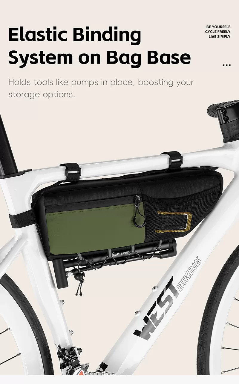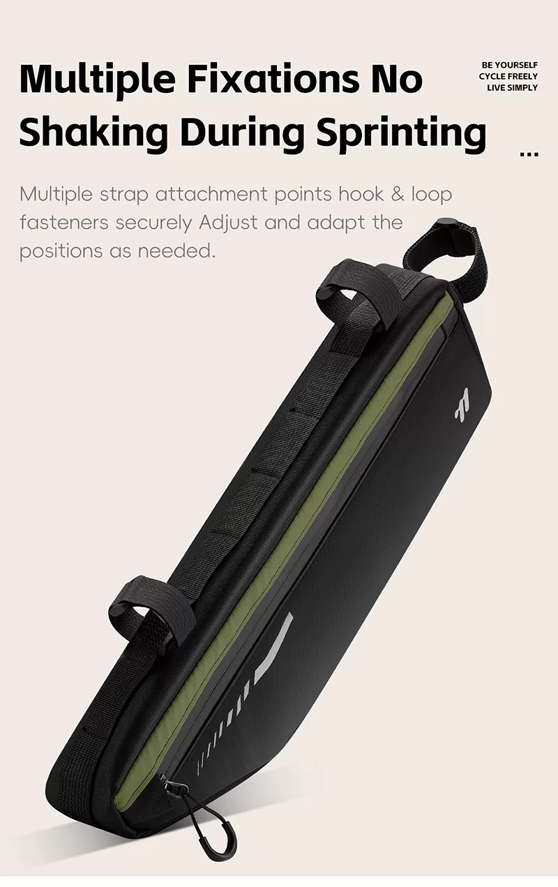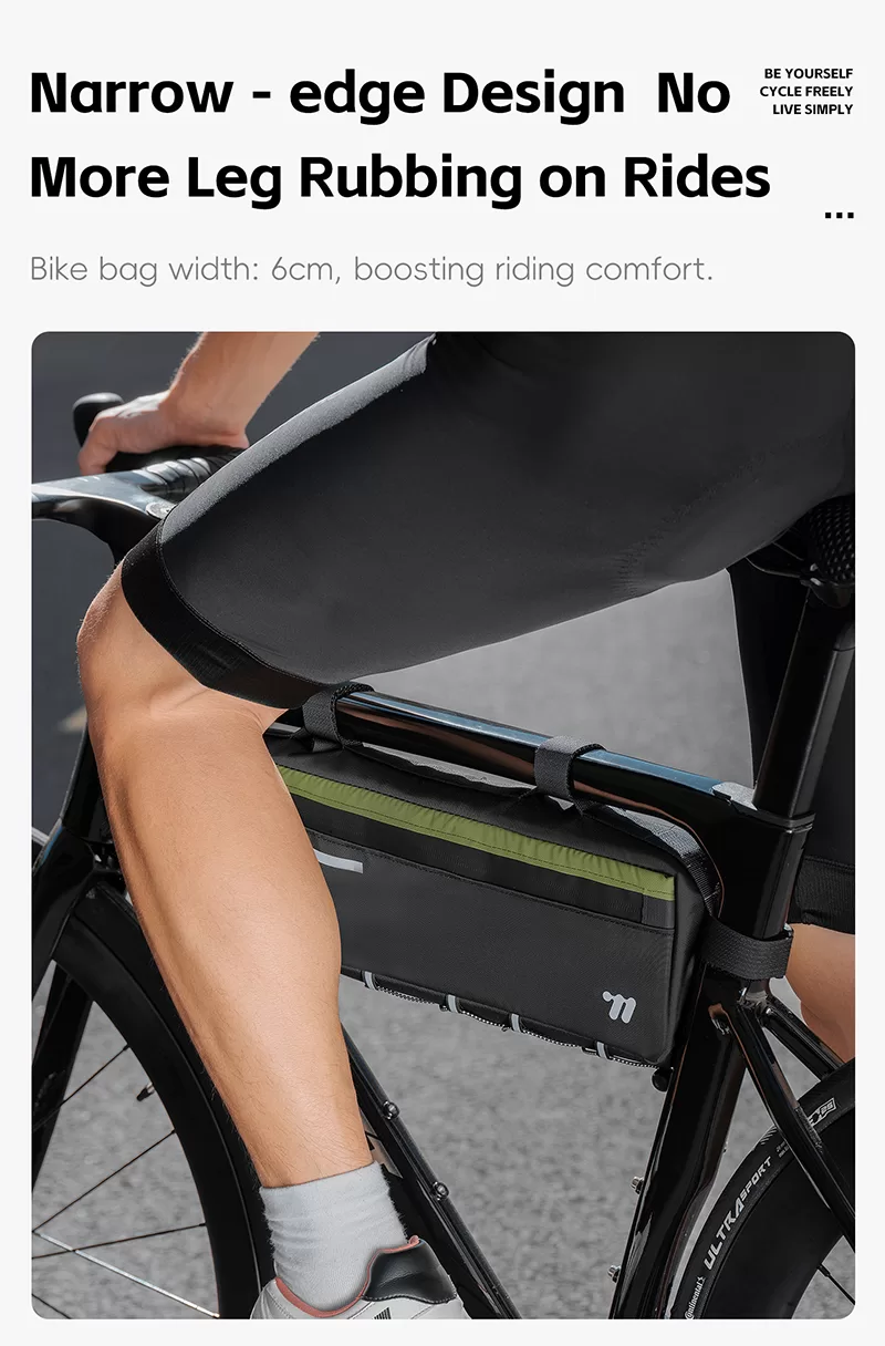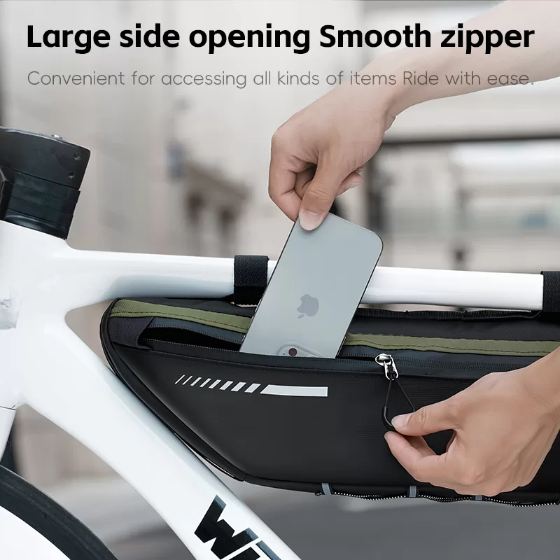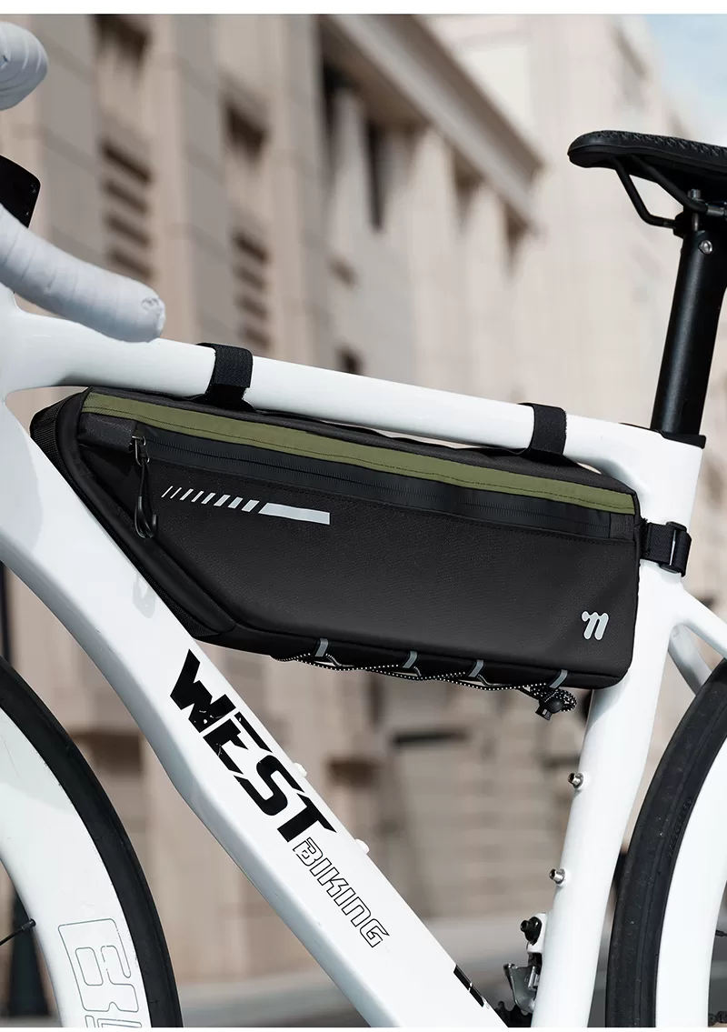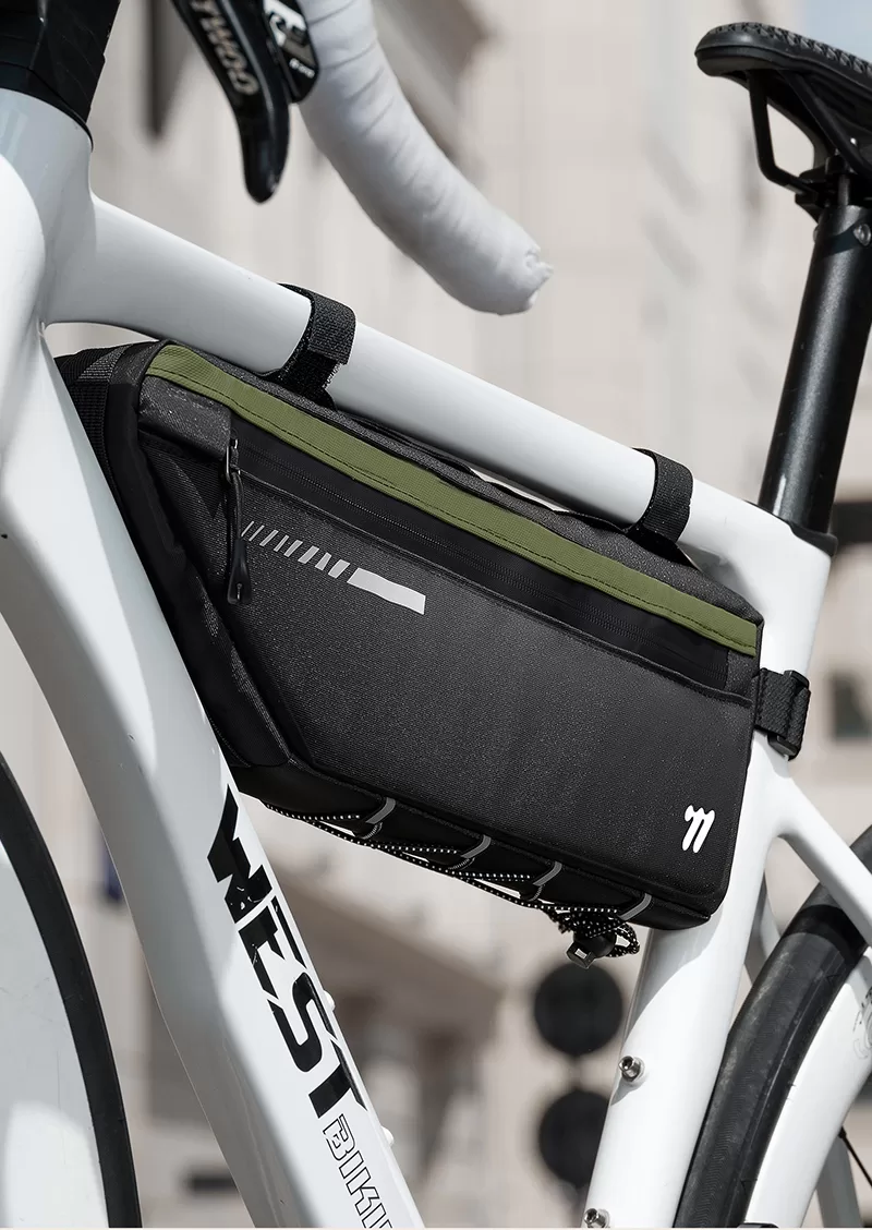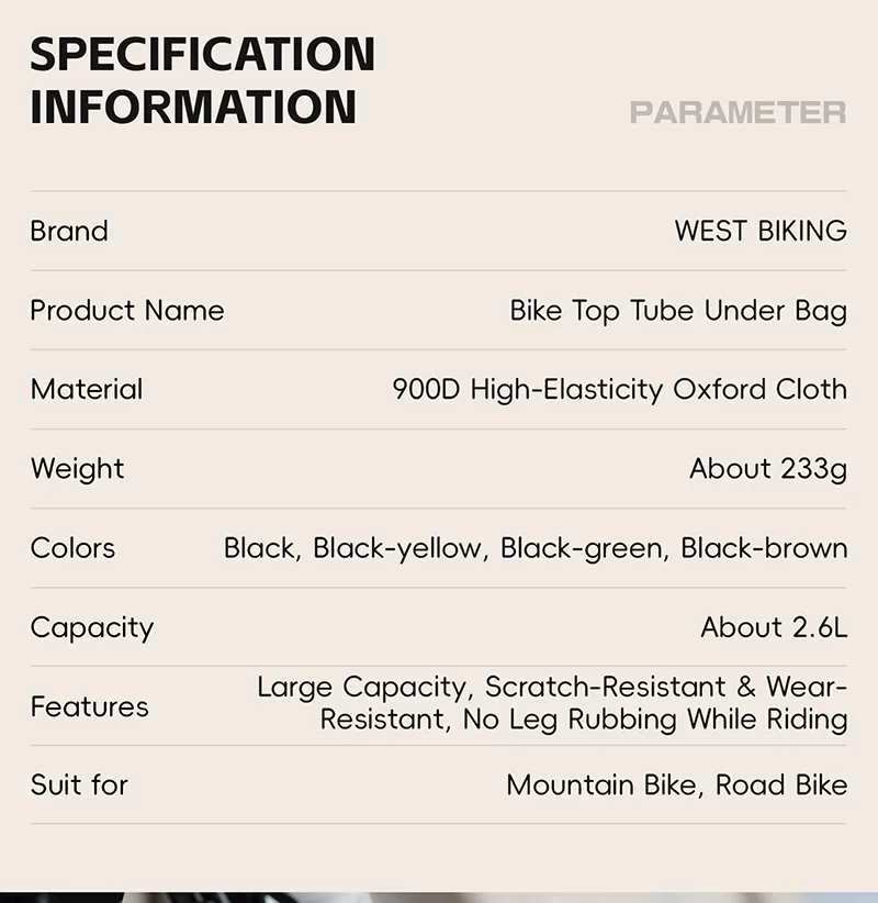 WEST BIKING Top Tube Under Bag is made of 900D high-elasticity Oxford fabric, which is scratch-resistant and wear-resistant. It features water-repellent fabric and waterproof zippers to prevent water seepage. Large-capacity side pockets allow for easy access to items. Multiple hook & loop fasteners keep it firmly fixed during riding without rubbing against your legs.
