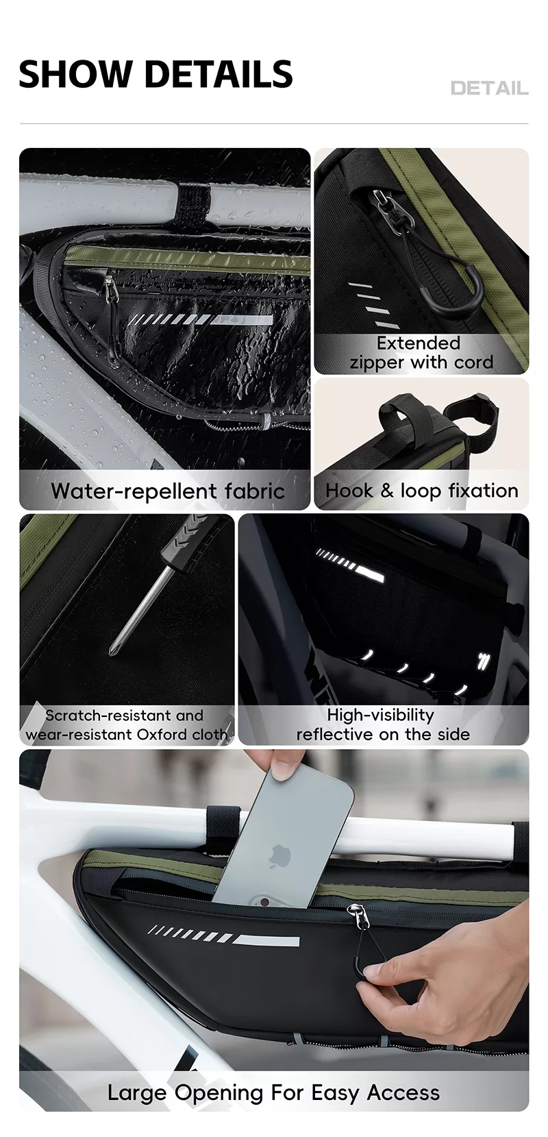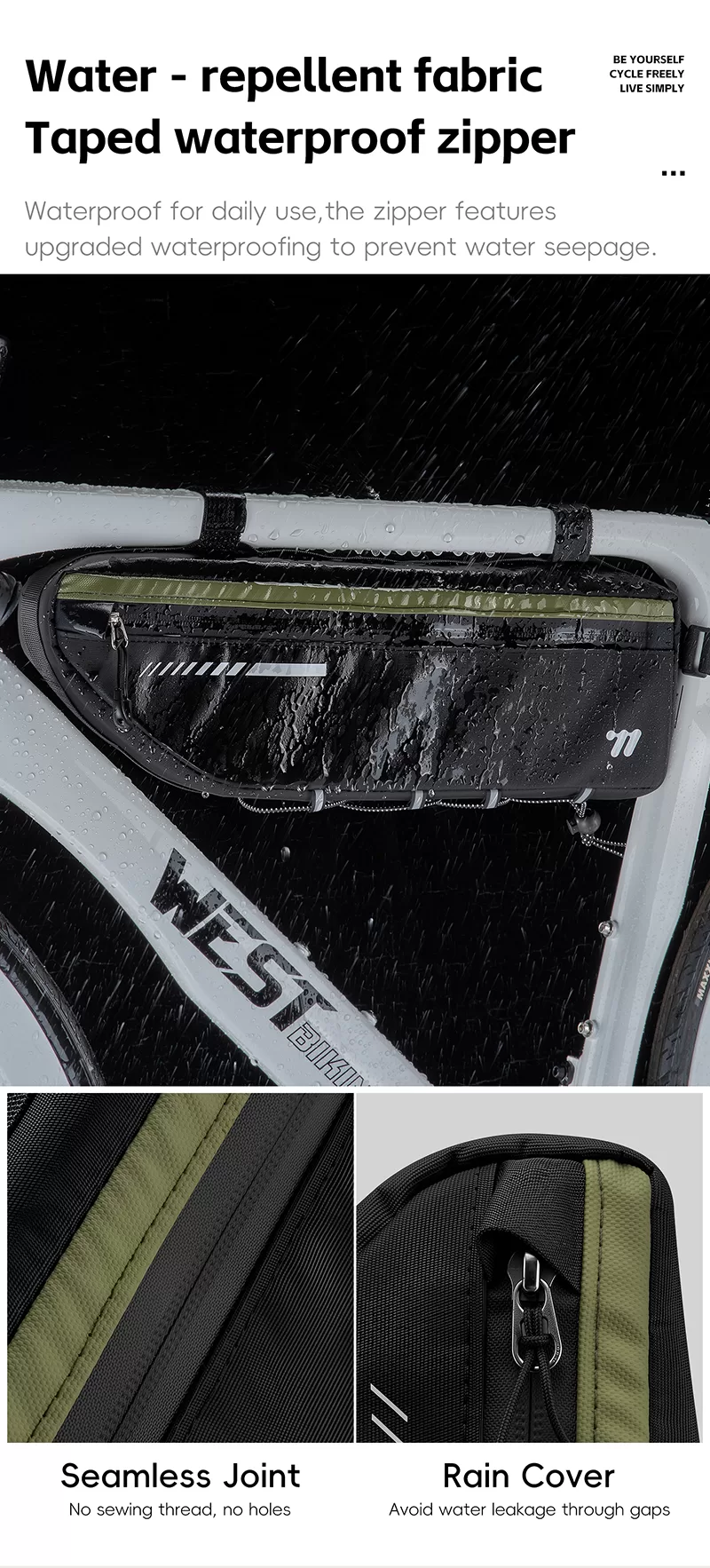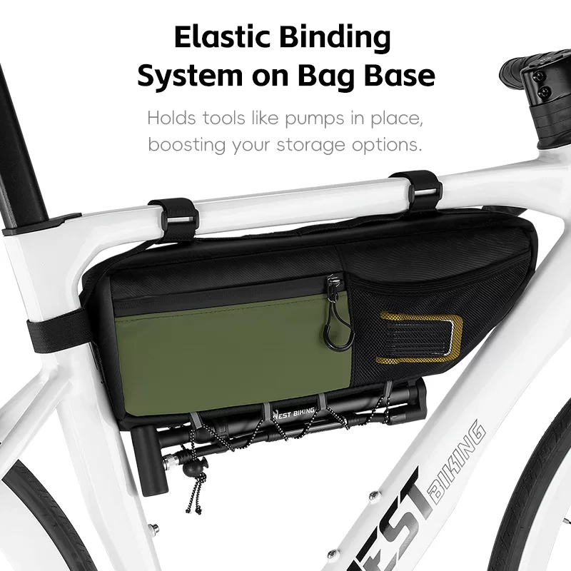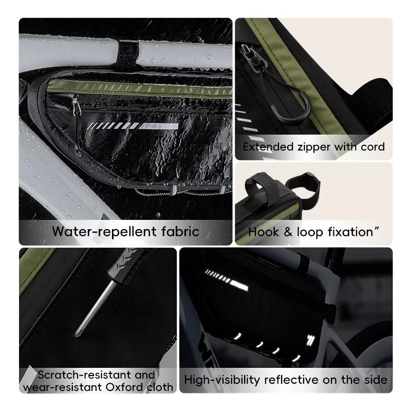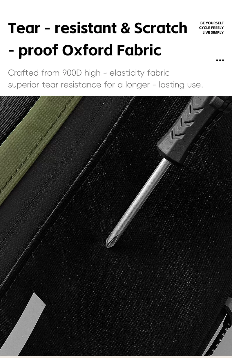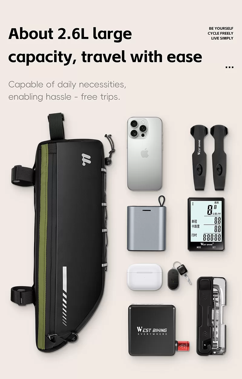 WEST BIKING Top Tube Under Bag is made of 900D high-elasticity Oxford fabric, which is scratch-resistant and wear-resistant. It features water-repellent fabric and waterproof zippers to prevent water seepage. Large-capacity side pockets allow for easy access to items. Multiple hook & loop fasteners keep it firmly fixed during riding without rubbing against your legs.